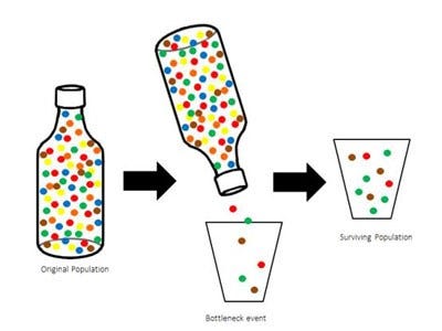 A genetic "bottleneck" occurs when an event significantly reduces how many members of a species' reproduce. Since only a small number reproduce a much smaller gene pool is passed onto future generations.